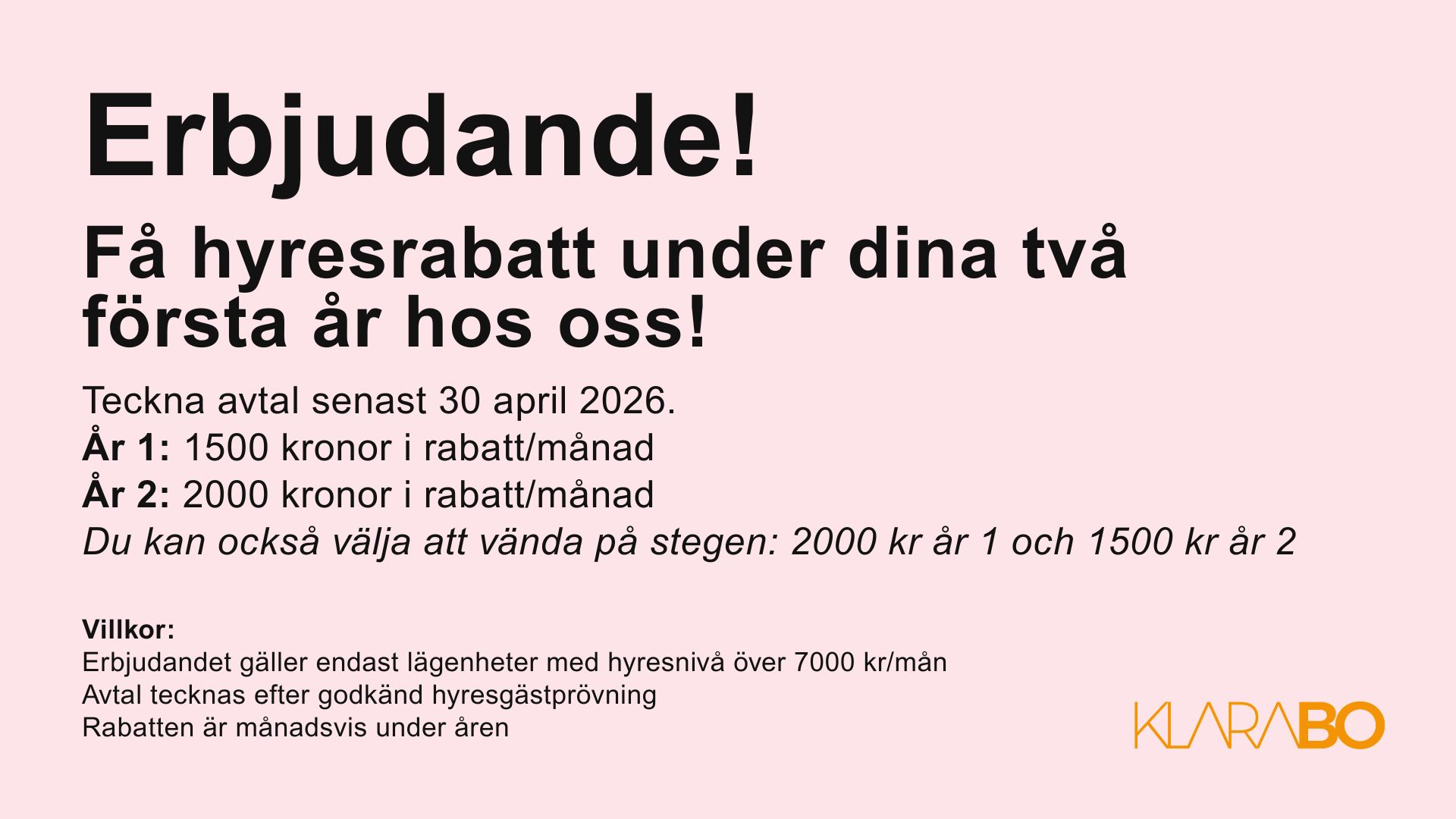 Fram till 2026-03-31 har du möjlighet att teckna avtal med hyresrabatt under två års tid – du läste rätt, två år!