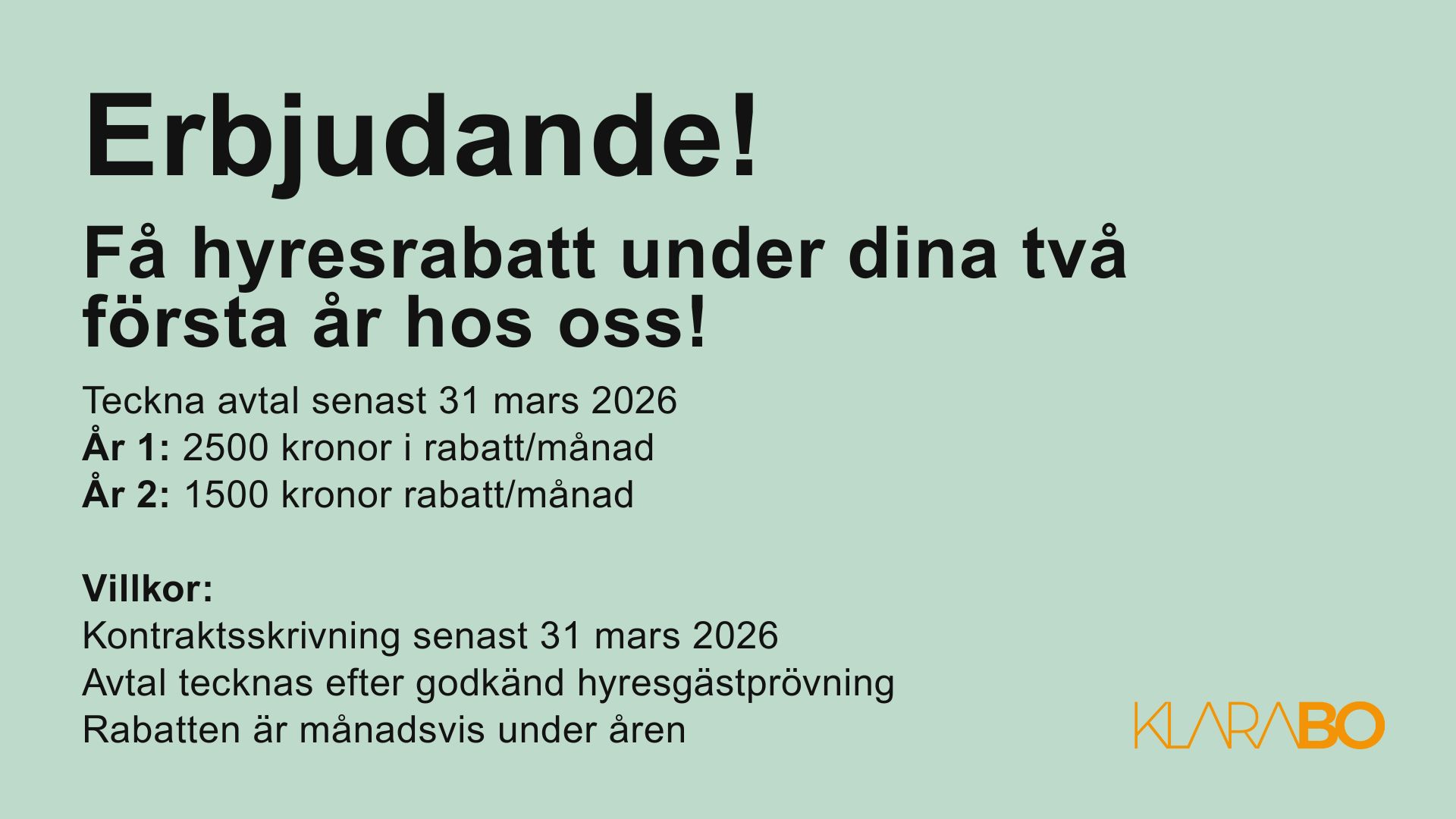 Fram till 2026-03-31 har du möjlighet att teckna avtal med hyresrabatt under två års tid – du läste rätt, två år!